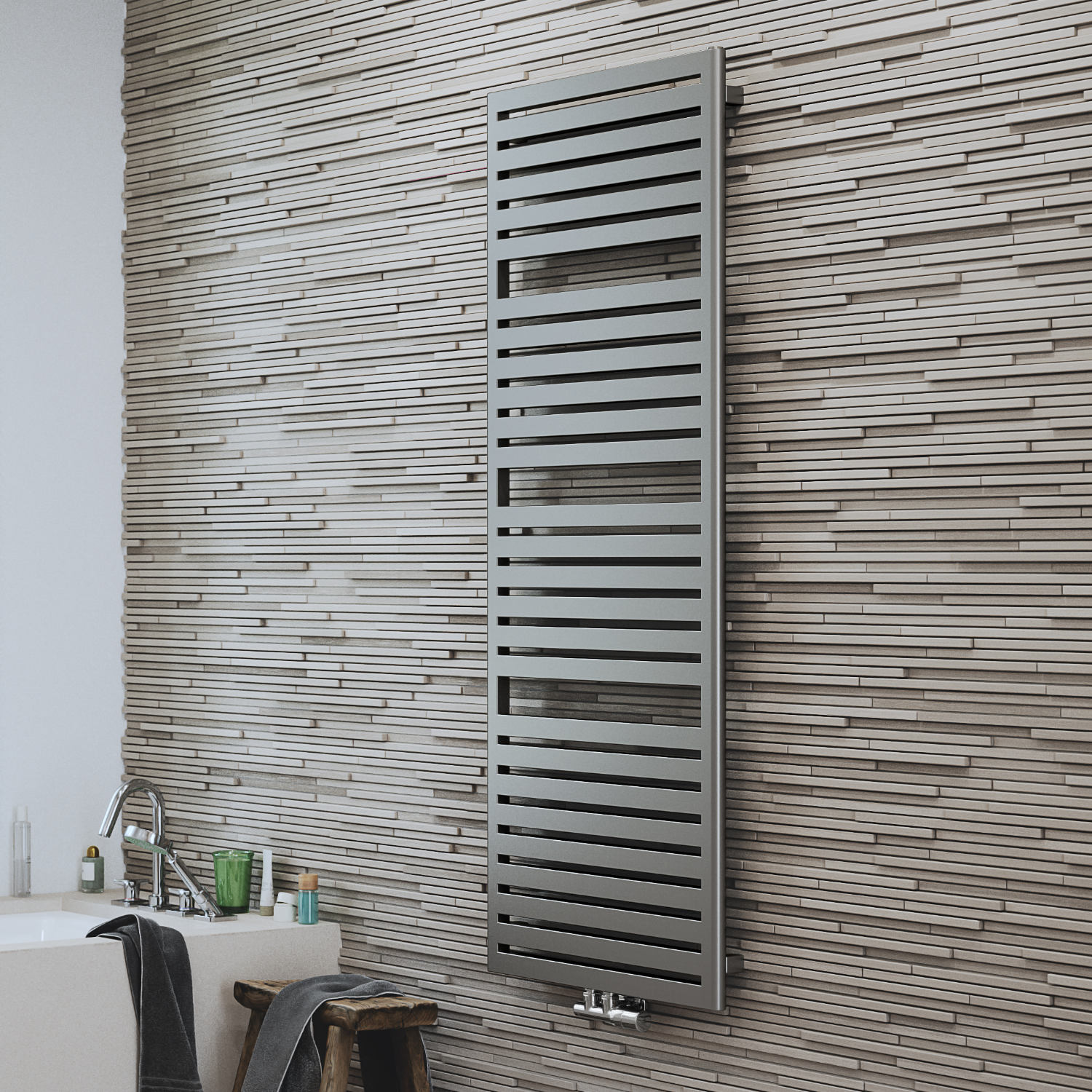 Iseloomulikud, korrapärased horisontaalsed vahed loovad stabiilse rütmi ja muudavad rätikute riputamise lihtsaks – ilma lisatarvikuteta ja kogu küttepinda varjamata.