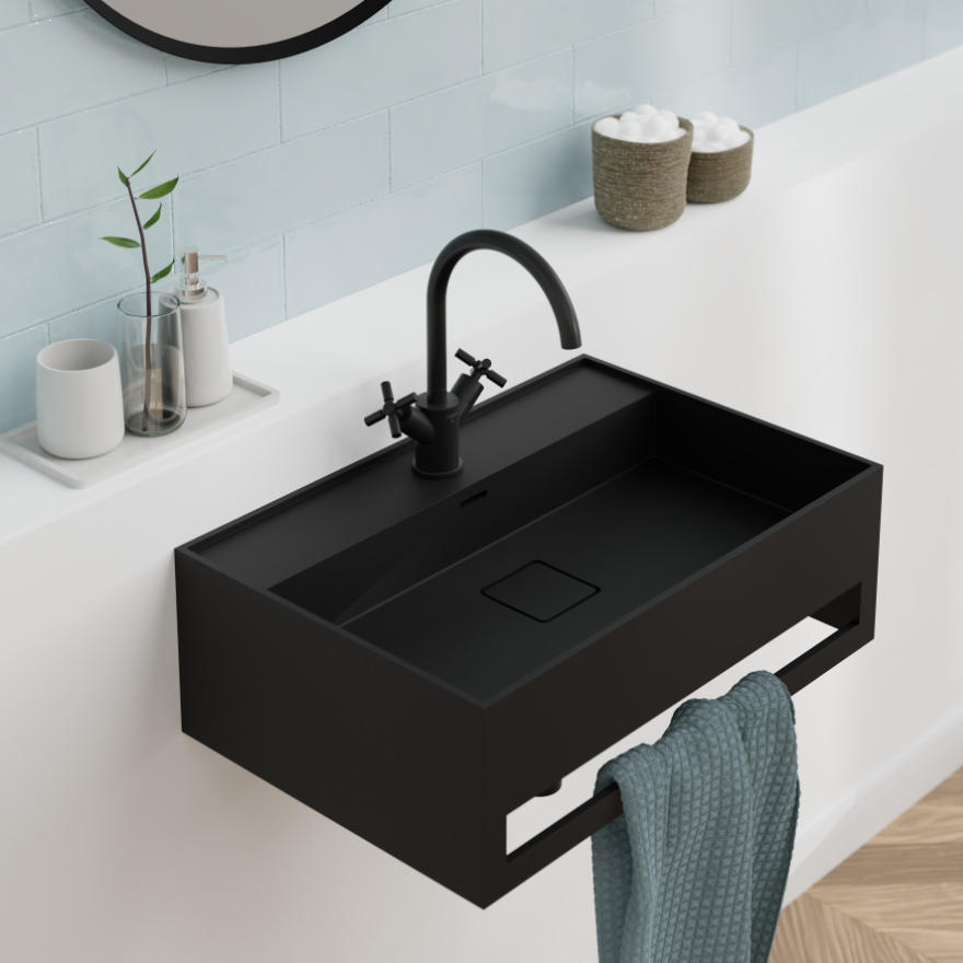 Integreeritud rätikuhoidja esiküljel, Solid Surface materjalist äravoolu kate komplektis.