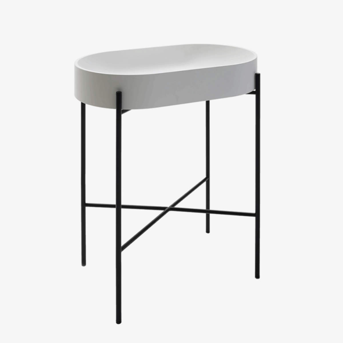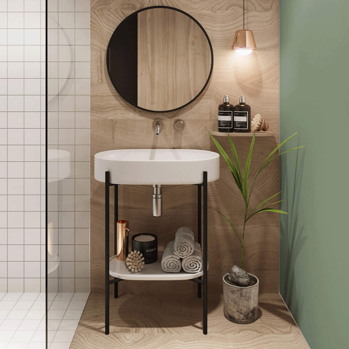 Jalgadel valamu, materjal LivingTec® komposiitkivi. Jalad messing, matt must või valge.