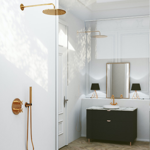 Stiilse kasutusmugavusega, 2 väljundiga, varustatud integreeritud tasapinnaga, termostaat veetemperatuuri seadmiseks, keraamilised tihendid. Diverter koos veevooluhulga reguleerimisega.