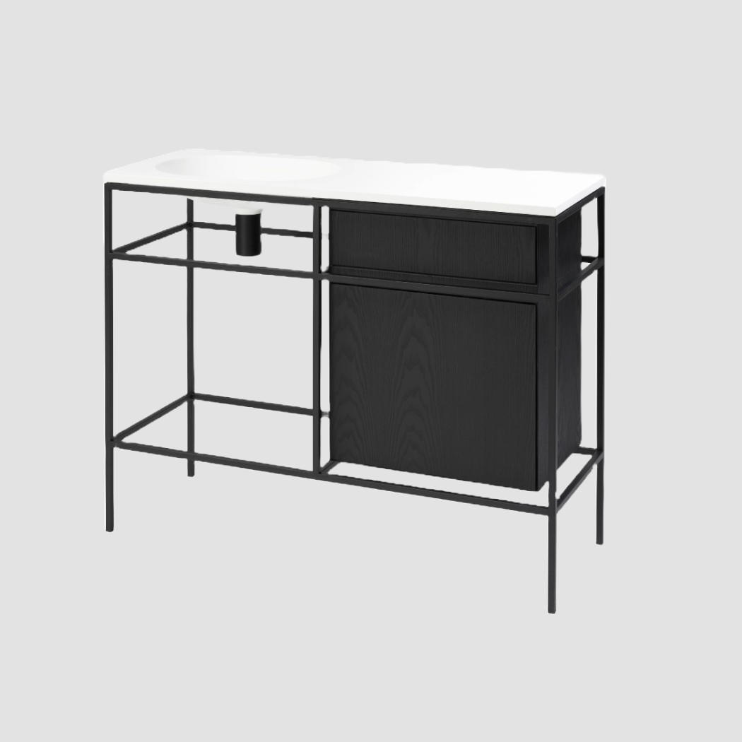 Frame valamuga moodul koosneb matt lakitud metallraam, LivingTec® komposiitkivist valamu, üks lakitud saare puidust sahtliosa ja alumine kapp.