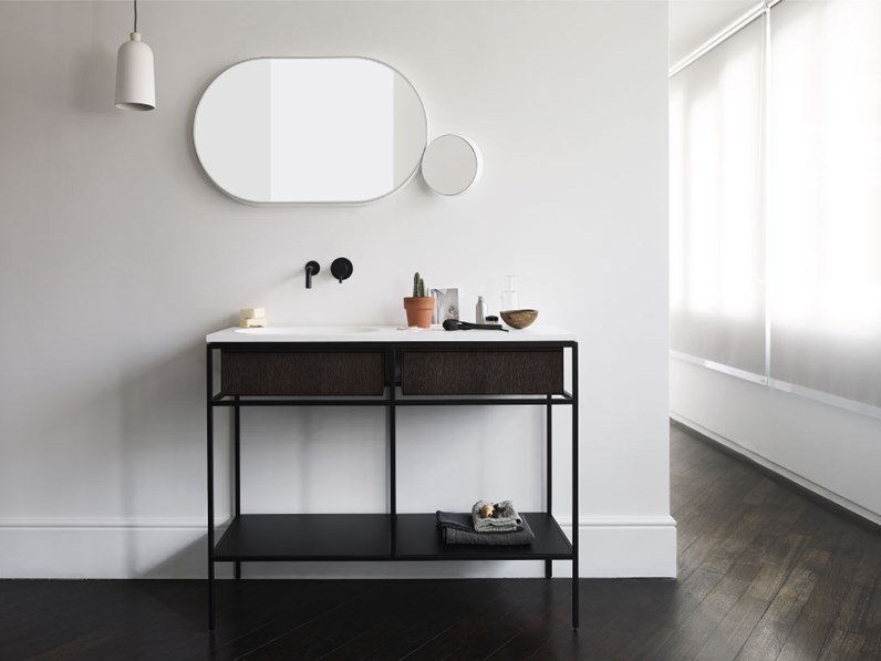 Sirge ja minimalistliku disainiga Frame, modulaarne vannitoamööbli süsteem.