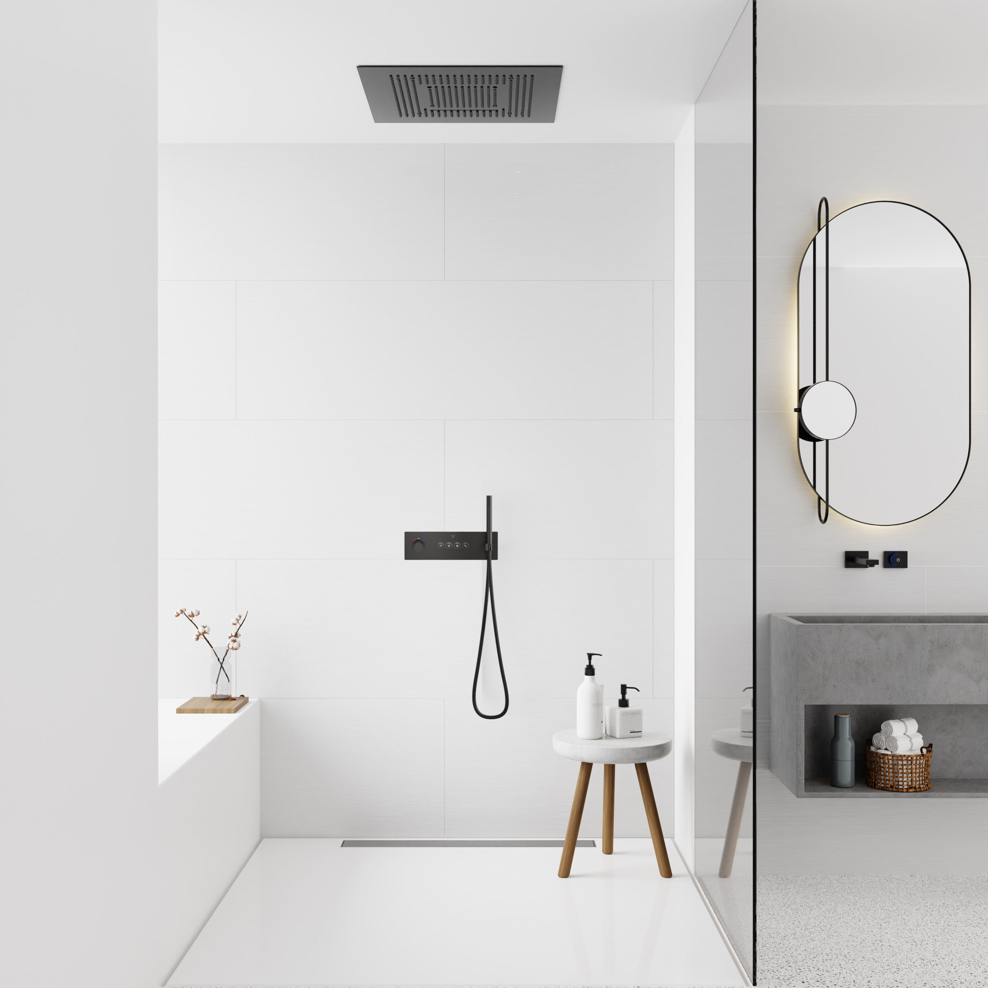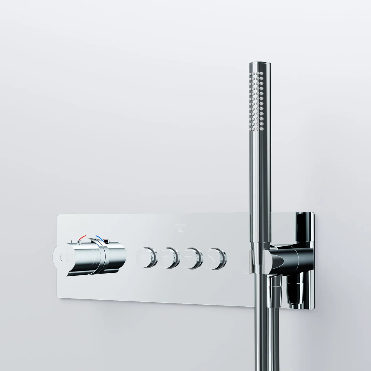 Stiilse kasutusmugavusega, 4 väljundiga, termostaat veetemperatuuri seadmiseks, veevoolu hulga reguleerimine väljundi nuppudest, varustatud integreeritud tasapinnaga, käsidušš koos dušivoolikuga, keraamilised tihendid.